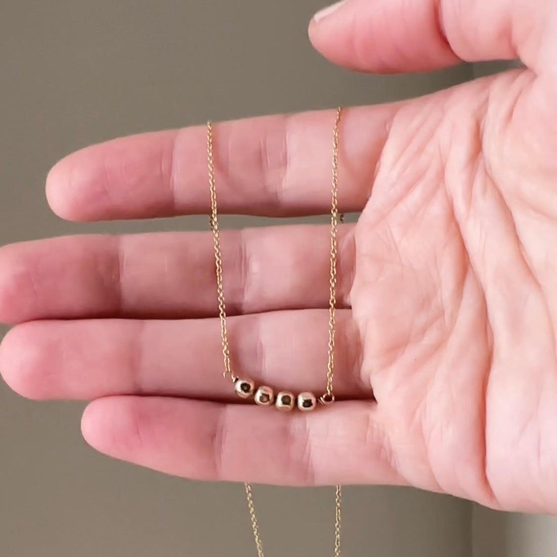 The My Wish For You Necklace, adorned with five silver beads, is elegantly presented on a card featuring a Ralph Waldo Emerson quote and publication details from Becoming Jewelry, making it the perfect gift.