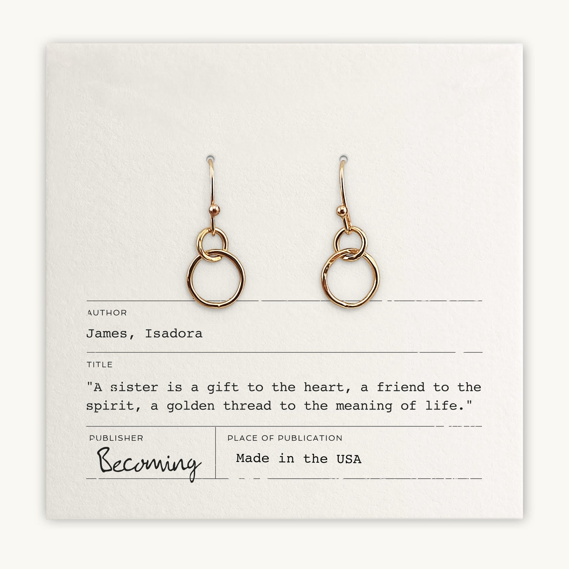 Discover beautiful handcrafted earrings designed to complement your jewelry collection with elegance and meaning. Each piece is beautifully packaged with a heartfelt message and crafted with the same attention to detail as our beloved necklaces. From delicate everyday studs to statement pieces that spark conversations our earrings celebrate the important relationships and moments in your life. Perfect for gifting or treating yourself to something special these meaningful pieces add the perfect finishing touch to any look. Find the perfect gift to celebrate your sister bond alongside pieces from our friendship jewelry and family collections.